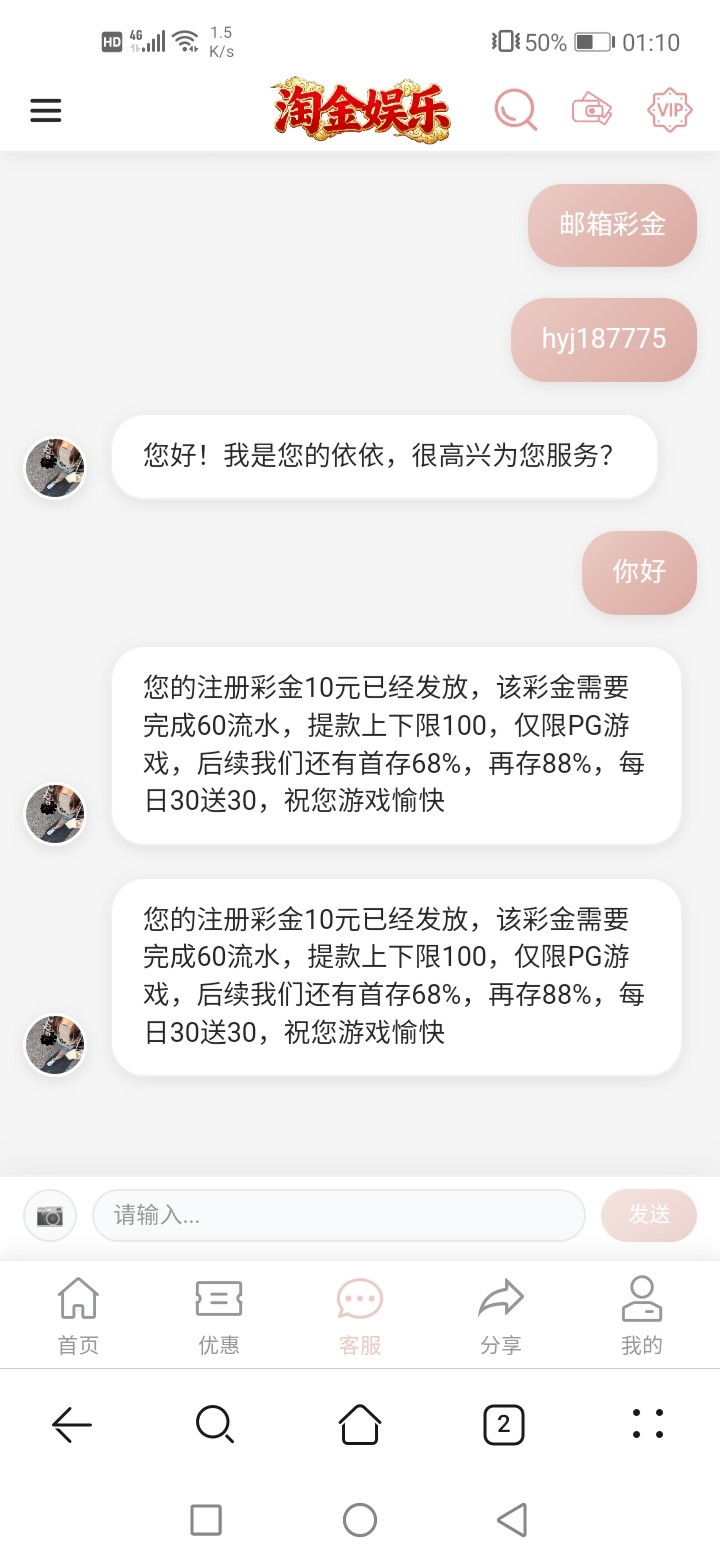 淘金娱乐限时彩金10快冲。先注册账号个人资料绑定手机号,邮箱号,还有姓名就行了然后直接去客服申请(我刚领到)没打出来